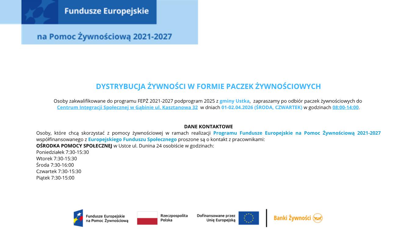 Odbiór pierwszej paczki będzie możliwy w terminie od 3 do 7 LUTEGO 2020 r. w siedzibie Gminnego Ośrodka Pomocy Społecznej w Ustce w godzinach: