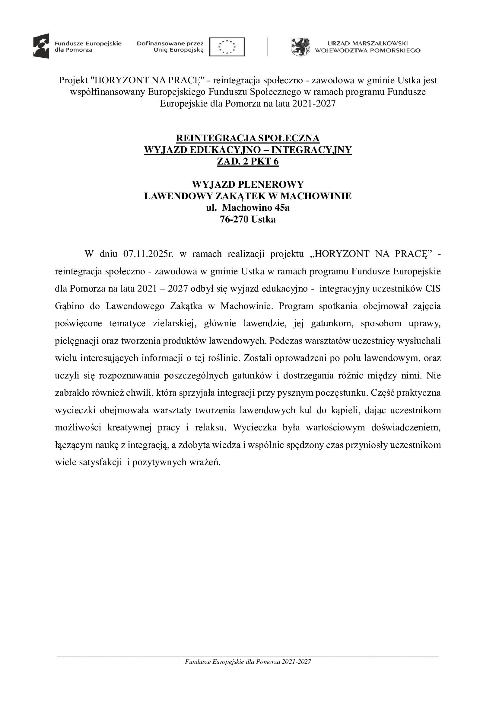 Stowarzyszenie Horyzont/ Centrum Integracji Społecznej w Gąbinie wraz z Gmina Ustka/ Gminnym Ośrodkiem Pomocy Społecznej w Ustce oraz Indeka Sp. z o.o realizują projekt partnerski pn. "HORYZONT NA PRACĘ" - reintegracja społeczno - zawodowa w gminie Ustka., w ramach programu Fundusze Europejskie dla Pomorza 2021-2027.